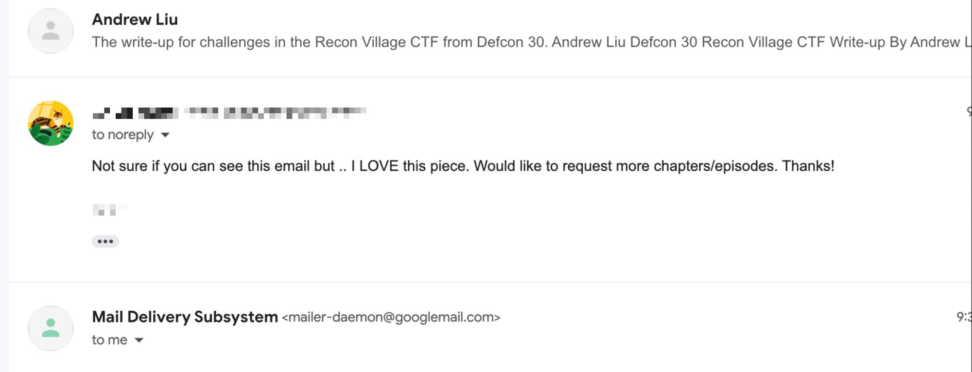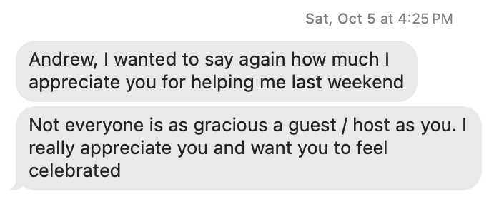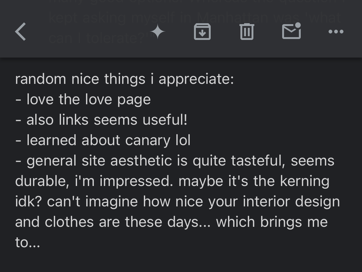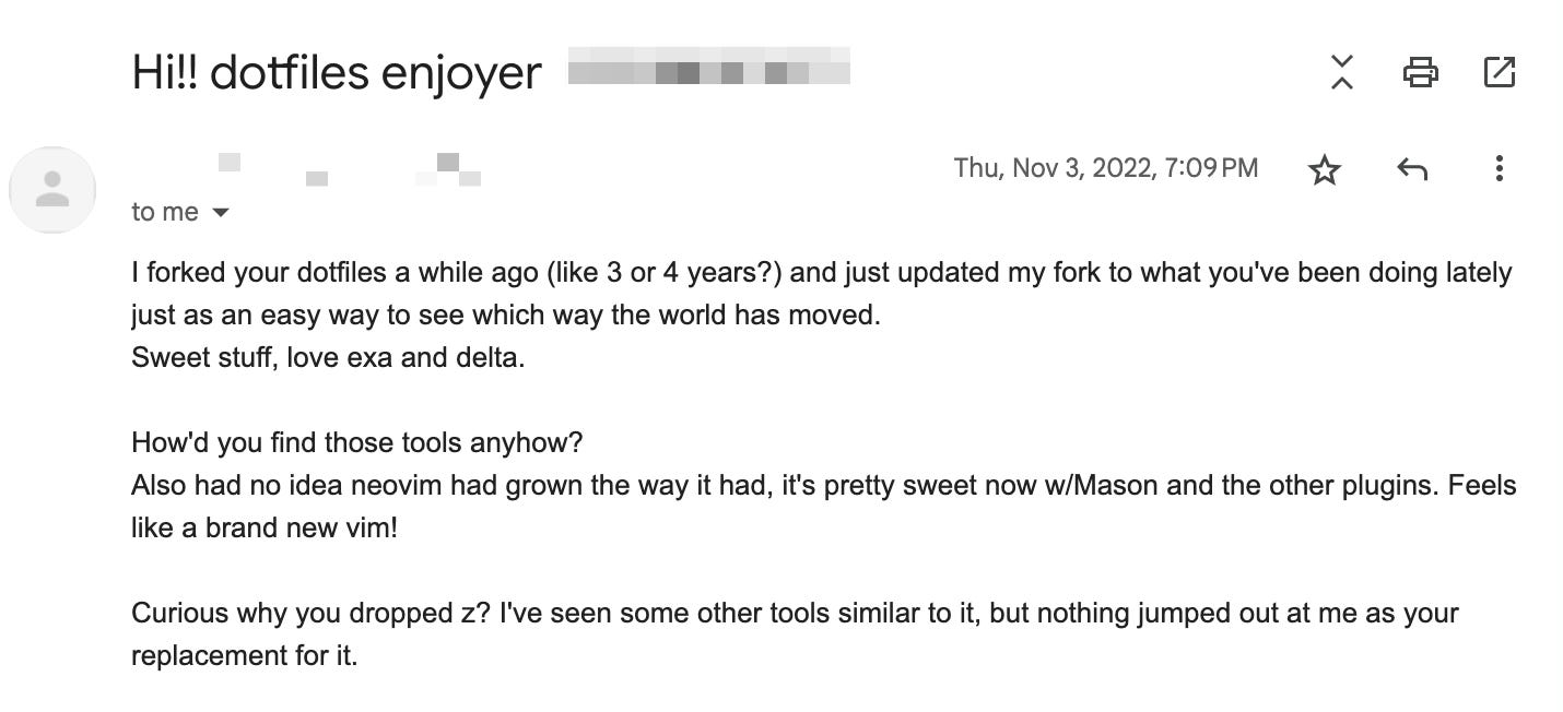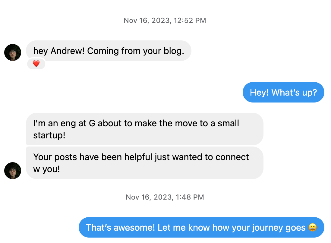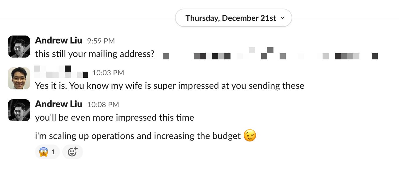 (April 2025) Now *that's* one hell of a book signing. (January 2025) I love that they love the love page. (October 2024) I was just trying to be a good person. 😳 (February 2024) People like my stuff! (December 2023) My holiday cards have been impressing wives since 2021. (November 2023) I'm helping people quit their jobs! (November 2022) This was the first cold email I ever received. I was stoked to read this. (August 2022) People like my writing! 🤗