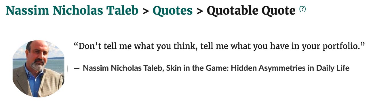 In Skin in the Game, Nassim Taleb made a great quote about investing advice. “Don’t tell me what you think, tell me what you have in your portfolio.” Here’s what I have in my portfolio:
