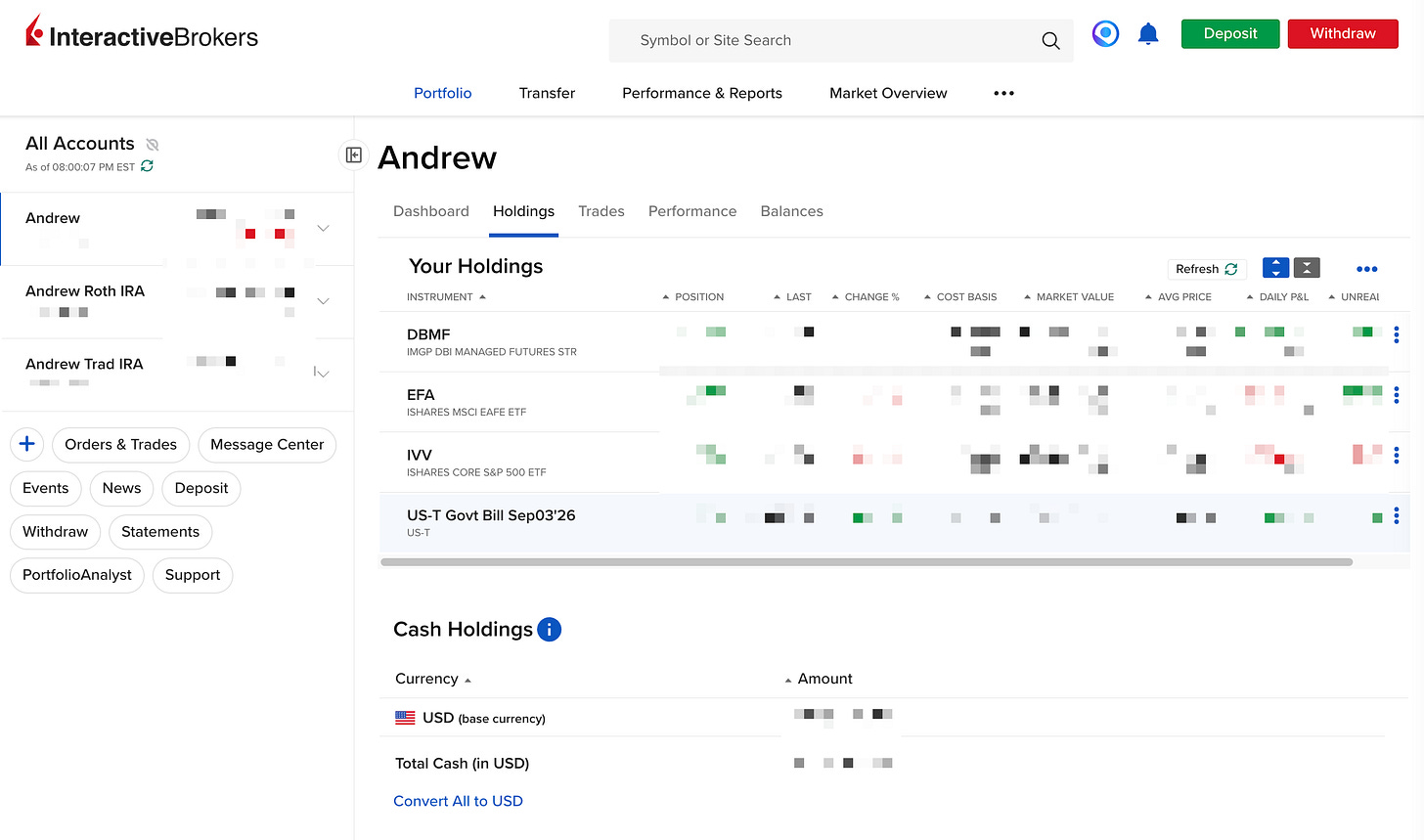 I hold IVV/EFA/DMBF with a 50/50/50 allocation. Three positions. That’s it. All equally weighted. My taxable portfolio is 1.5x leveraged (hence it’s not a 33/33/33 allocation). For every two dollars I have, I borrow one dollar on margin. Do not take leverage if you don’t know what you’re doing. Taking leverage can fuck you and kill decades of progress. You can get by just fine without leverage.