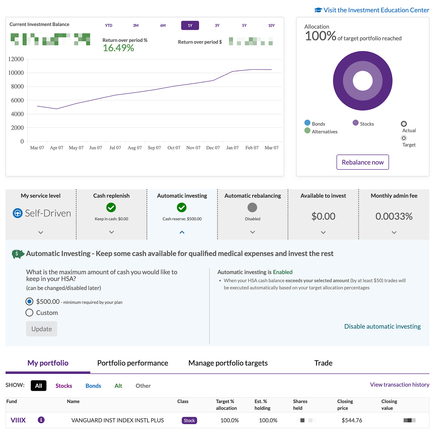 For my tax-advantaged portfolios, it’s a lot simpler. I just go 100% in the S&P 500. No leverage. It’s all auto-invested. My two investment accounts are my 401(k) and my HSA. In my 401(k), the portfolio is completely in Vanguard’s S&P 500 proxy. In my HSA, the portfolio is completely VIIIX, which is some other S&P 500 proxy. The exact fund doesn’t matter: VOO, IVV, or some other S&P 500 proxy will all have 99.9% correlation. These were not deliberate strategic decisions on my part; I just picked whatever S&P 500 proxy was available.